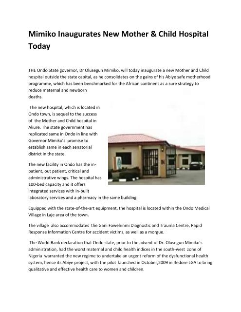 Mimiko Inaugurates New Mother Child Hospital Today Ondo State